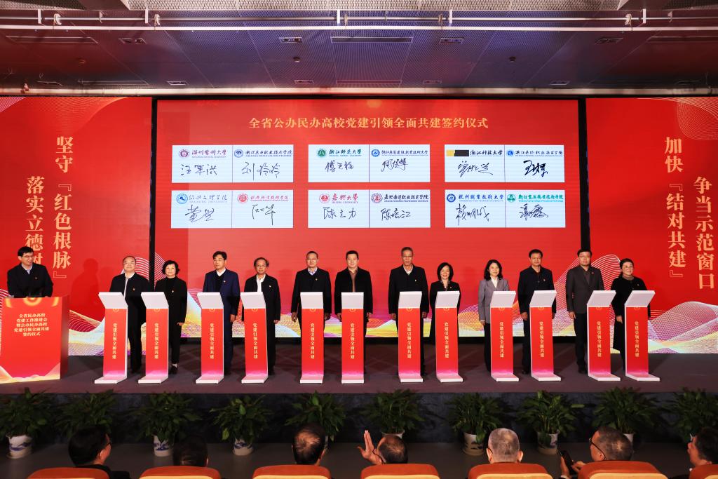 为贯彻落实中共中央关于加强民办学校党的建设工作的意见和全国全省高校党的建设工作会议精神,提升高校党建工作质效,推动党建与事业发展深度融合,以高质量党建引领高等教育事业高质量发展,11月19日,全省民办高校党建工作推进会暨公办民办高校党建引领全面共建签约仪式在中国美术学院南山校区举行。省委教育工委专职副书记、省教育厅党组副书记许翰信,省教育厅(省委教育工委)组织处处长陈钦林、设区市党委教育工委分管领导、公民办结对共建高校党委负责人出席活动。